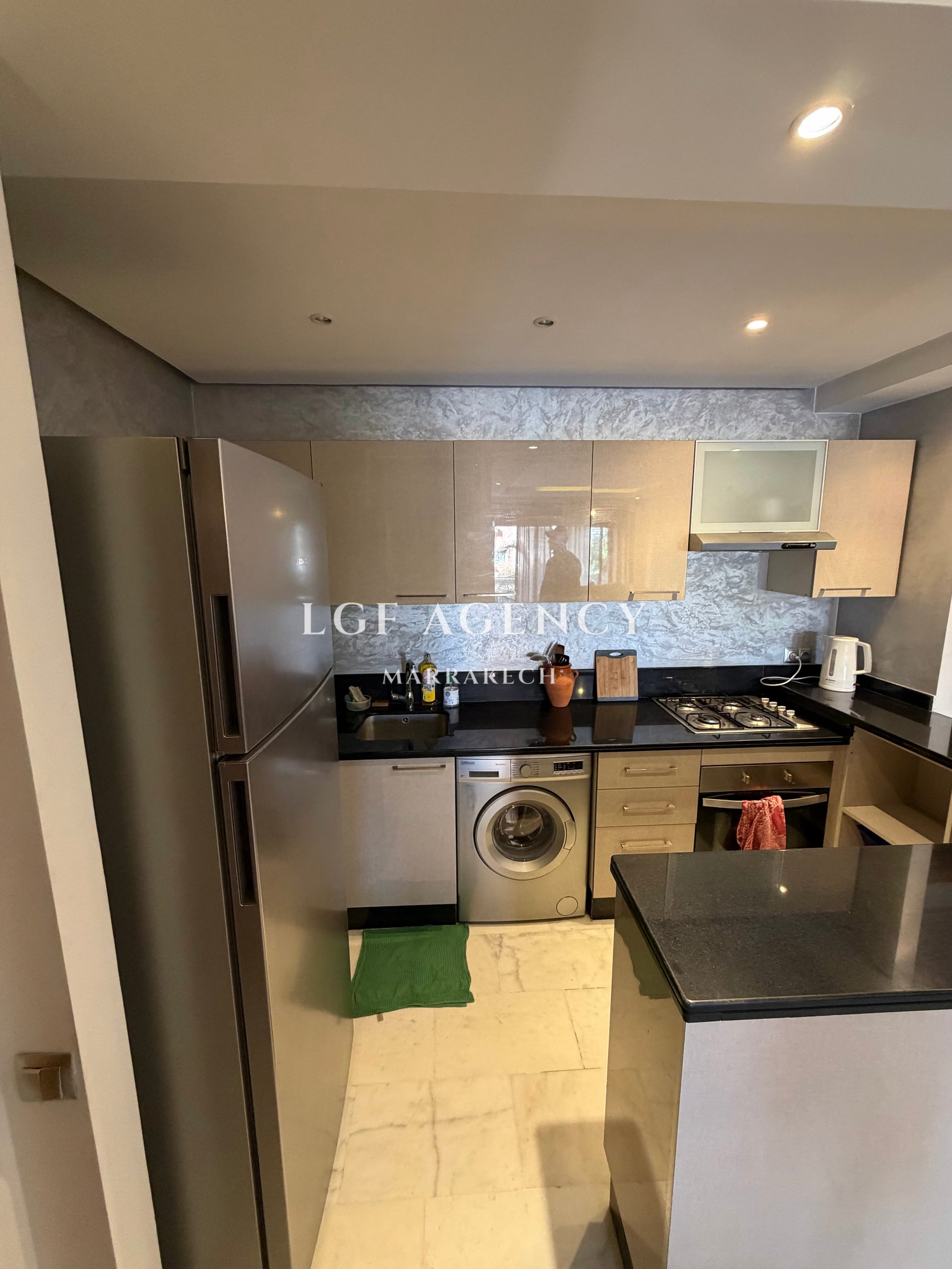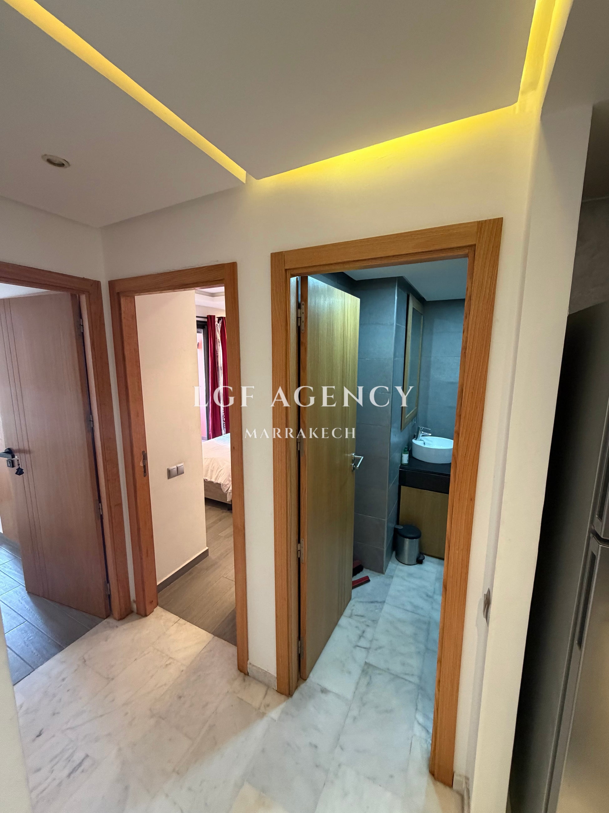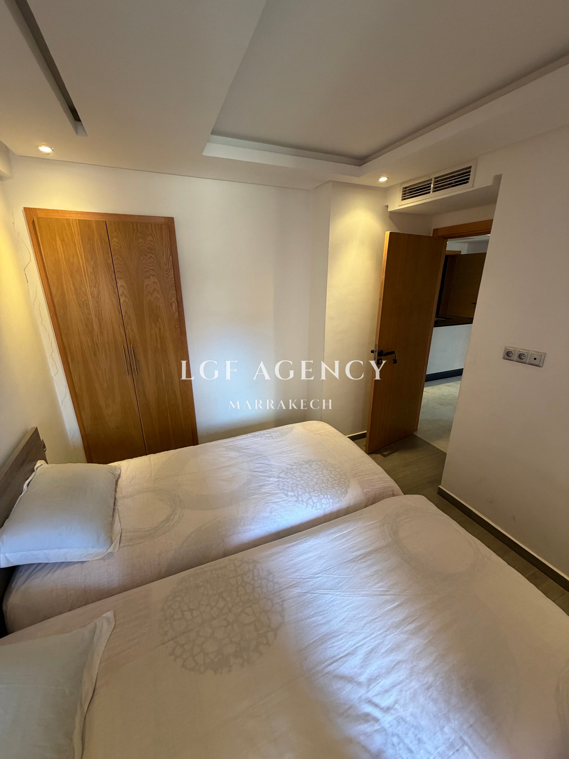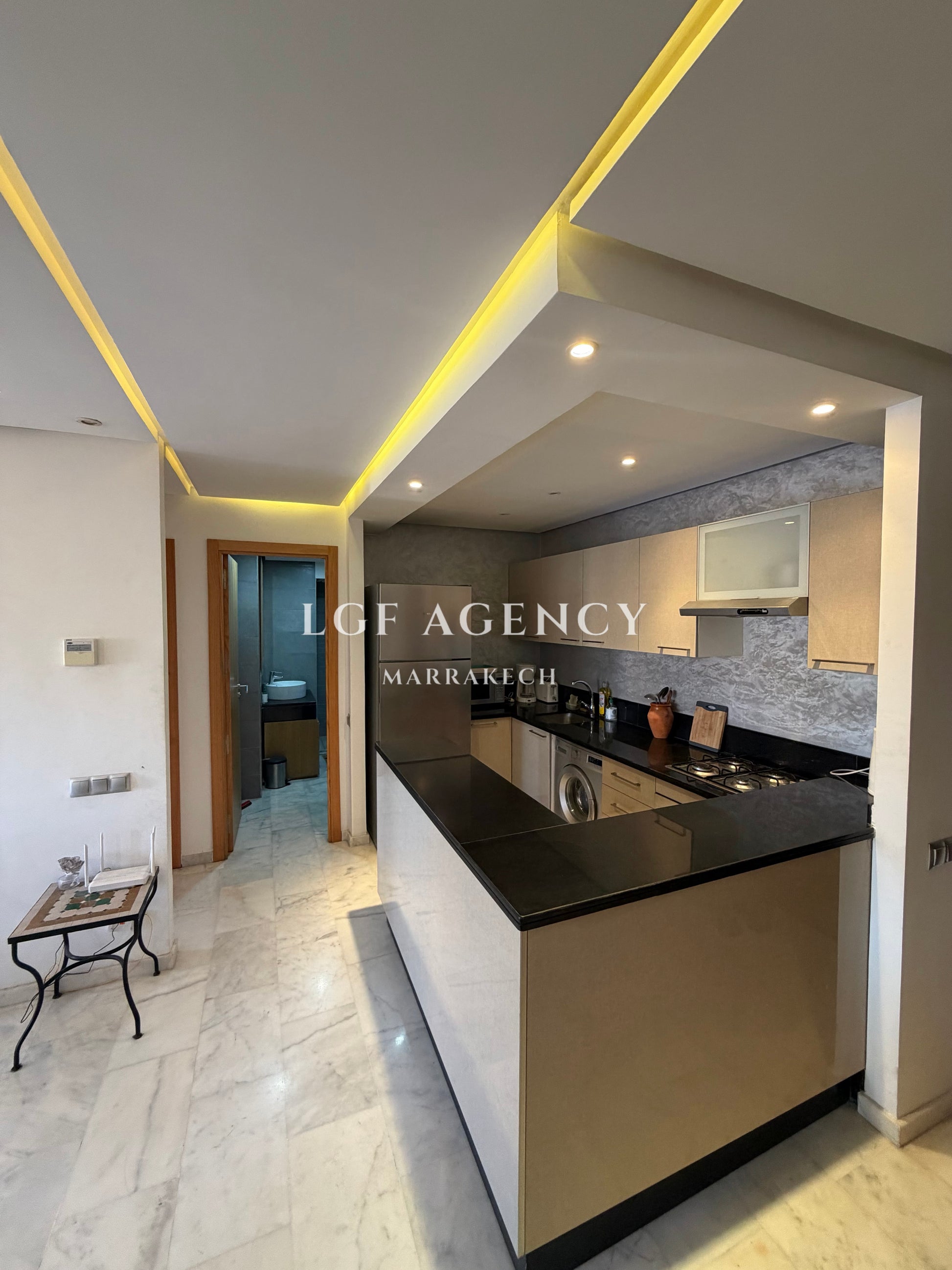 Situé en plein centre de Guéliz, cet appartement moderne se trouve dans une résidence récente construite en 2018, sécurisée et bien entretenue.