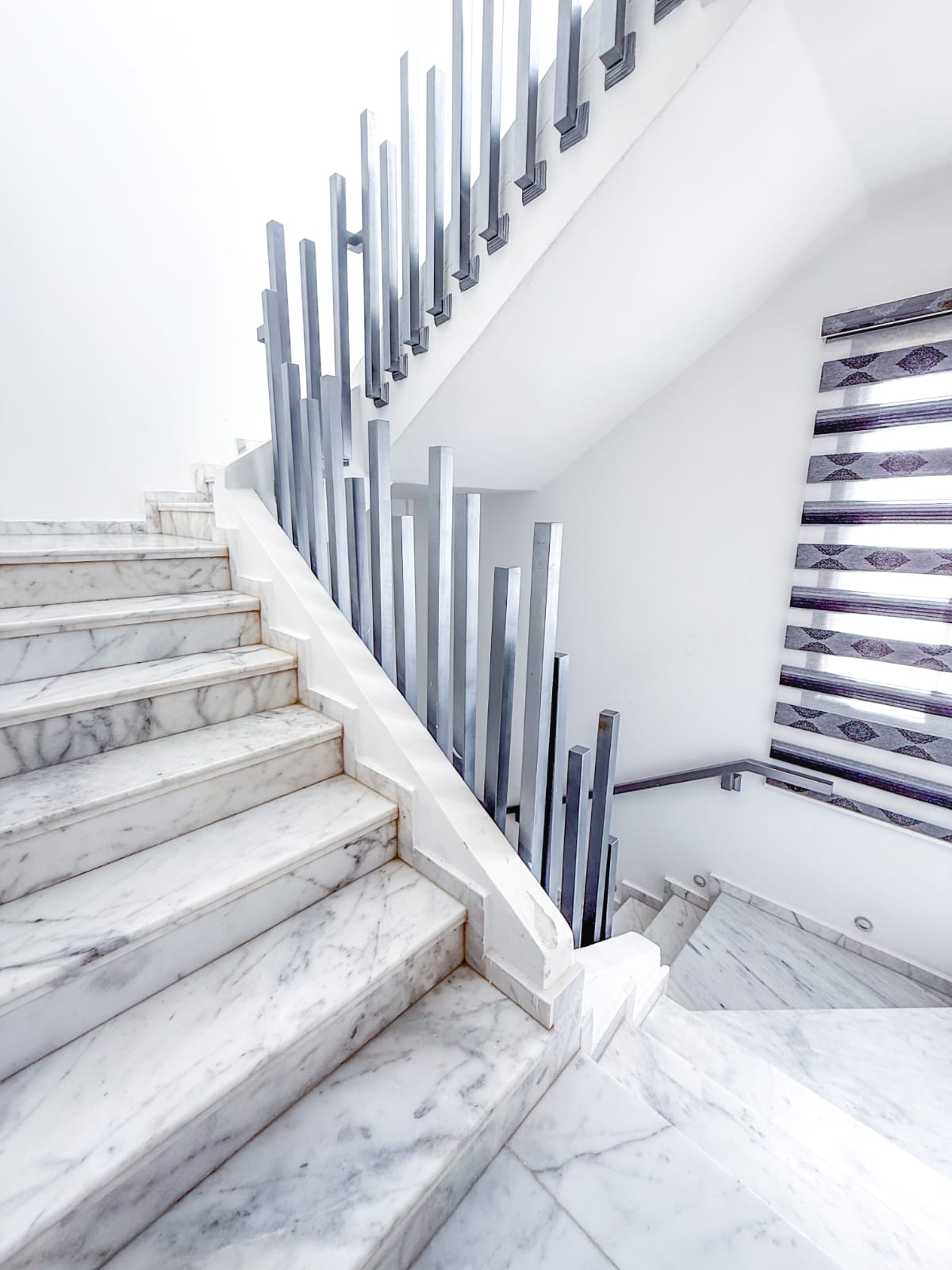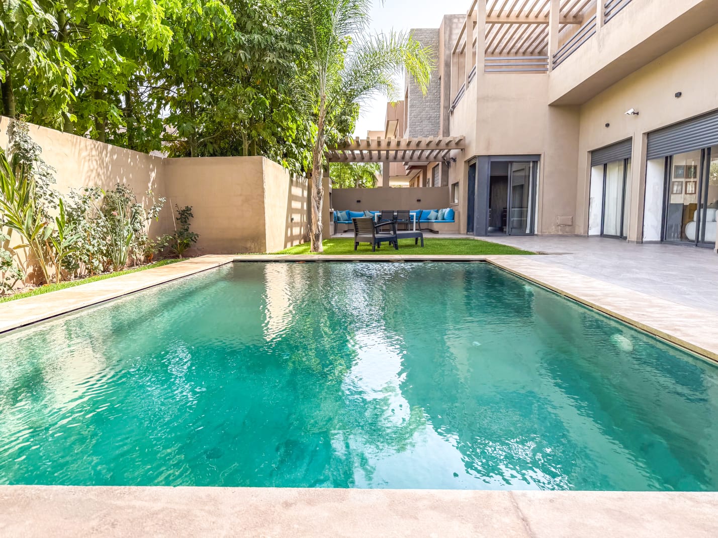 La suite parentale en rez-de-chaussée dispose d’une vue piscine, d’un accès direct au jardin et d’un hammam privatif. À l’étage, trois suites indépendantes avec salles de bain et dressings s’ouvrent sur une grande terrasse surplombant le jardin et la piscine.